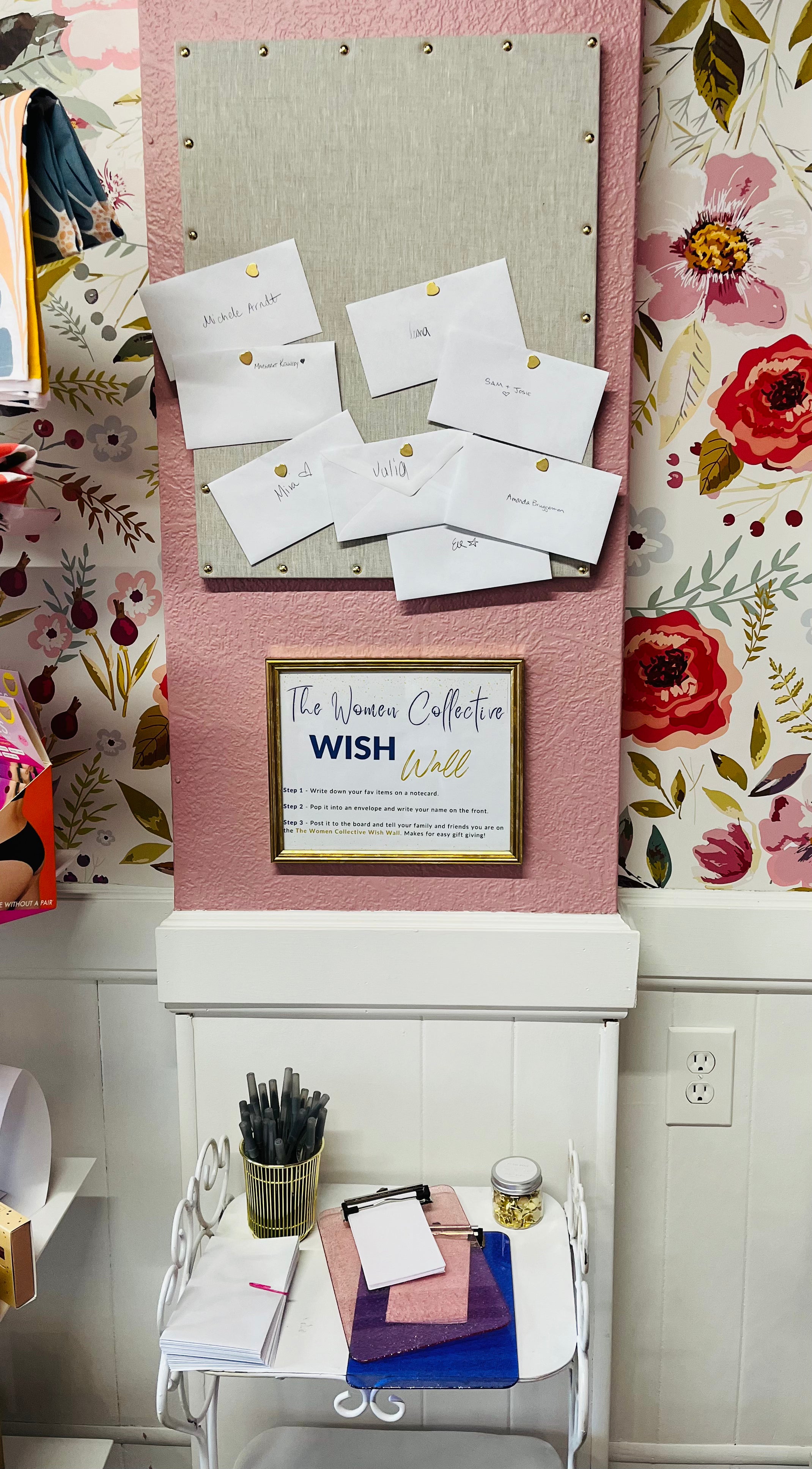 The Wish WallThe Wish Wall makes gift giving (and receiving) easy. Pop into the store, grab a clipboard and pen and jot down all the goodies that make you happy. Pop it into an envelope, write your name on the front and post to the wish wall. Send your spouse, partner, family and friends into The Women Collective and we'll help curate the perfect gift for YOU!