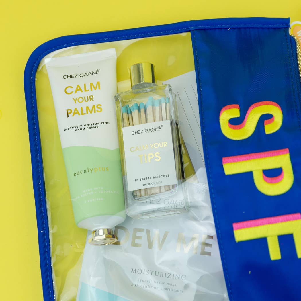 Light a candle, take a breath, and Calm Your Tips. These aqua-tipped safety matches are packaged in a sleek glass bottle with a luxe gold lid, making them as pretty as they are practical. A cheeky play on words with everyday function, this design-forward accessory is perfect for candle lovers, gift bundles, or anyone in need of a little laugh while they strike a match.