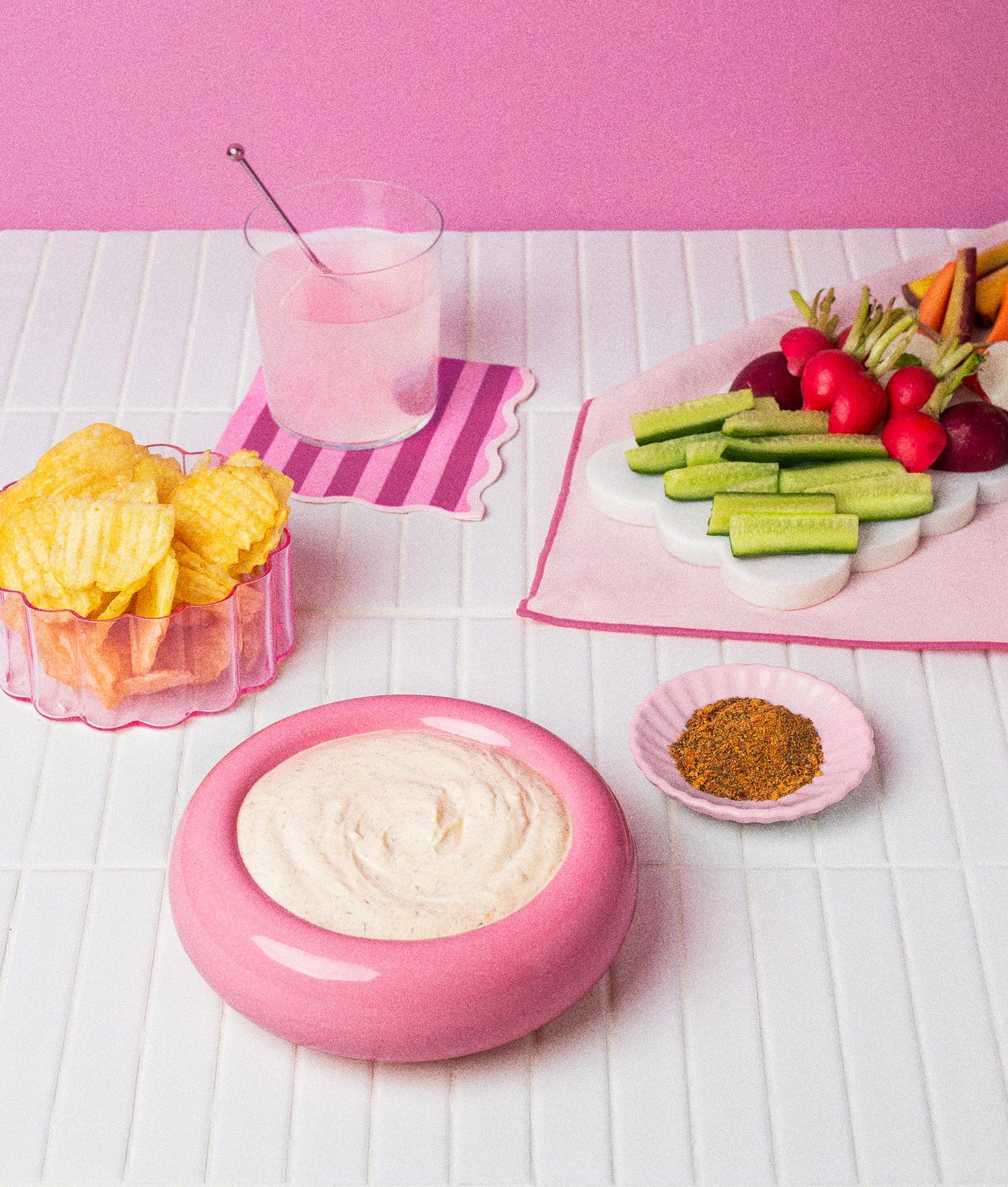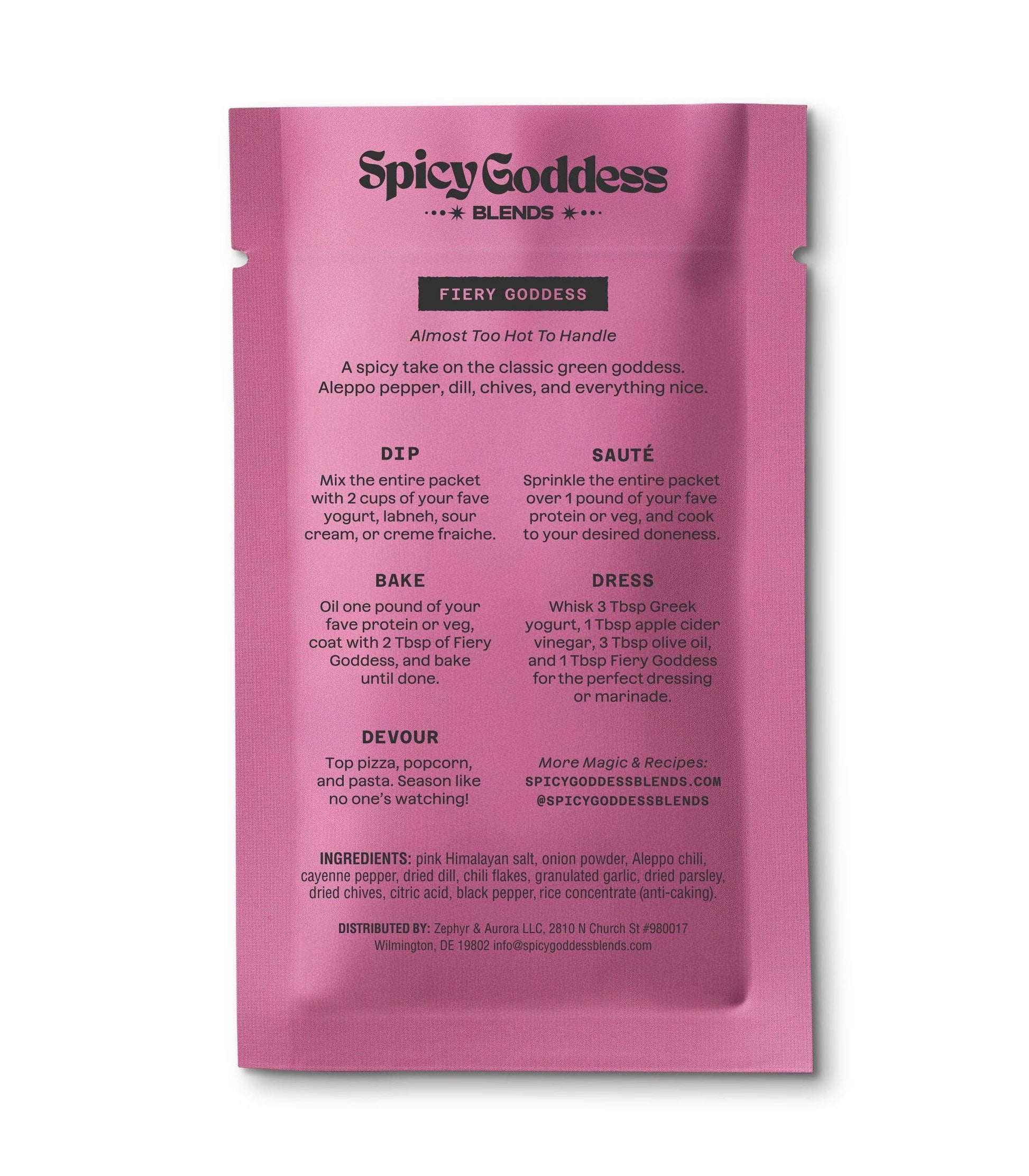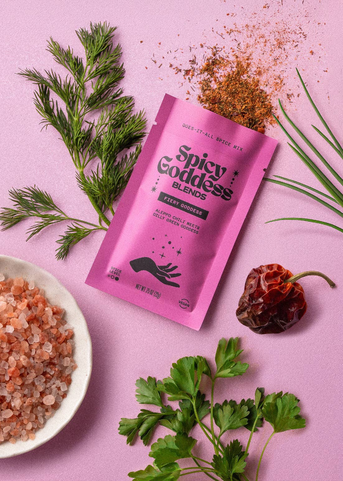 Ingredients: pink Himalayan salt, onion powder, Aleppo chili, cayenne pepper, dried dill, chili flakes, granulated garlic, dried parsley, dried chives, citric acid, black pepper, rice concentrate