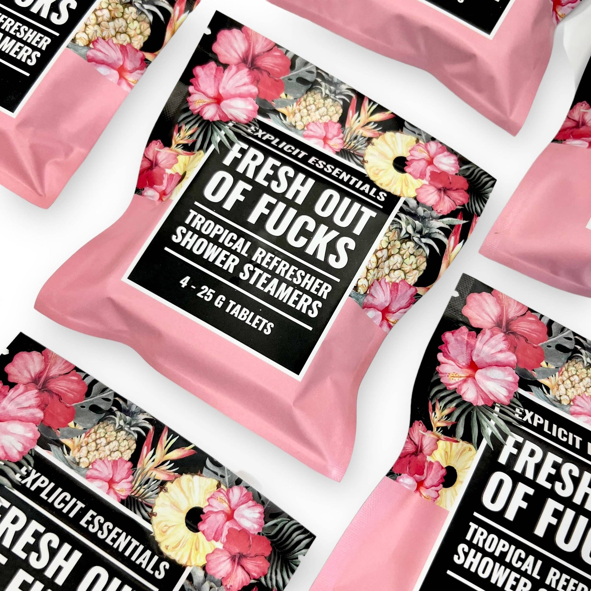Elevate your shower routine with the luxurious Fresh Outta Fucks Shower Steamers. This set of 4 tropical citrus-scented steamers is designed to turn your ordinary shower into a blissful escape. As the steam rises, it carries the refreshing aroma of grapefruit, and hibiscus creating a soothing atmosphere that helps melt away stress and tension. Each steamer is infused with essential oils, delivering a burst of invigorating fragrance that lingers on your skin long after you step out of the shower. Whether you're looking to unwind after a long day or seeking the perfect gift for a loved one, Fresh Outta Fucks Shower Steamers are the ultimate indulgence.