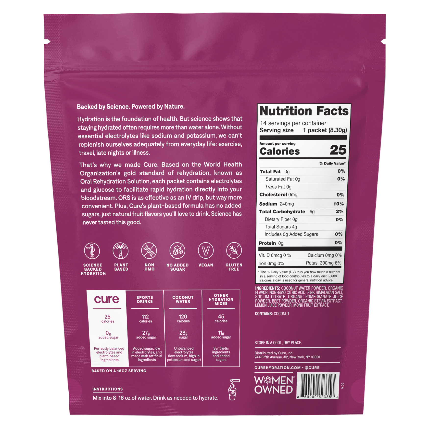 That’s why we made Cure. Based on the World Health Organization’s gold standard of rehydration, known as Oral Rehydration Solution, each packet contains electrolytes and glucose to facilitate rapid hydration directly into your bloodstream. ORS is as effective as an IV drip, but way more convenient. Plus, Cure’s plant-based formula has no added sugars, just natural fruit flavors you’ll love to drink. Science has never tasted this good.