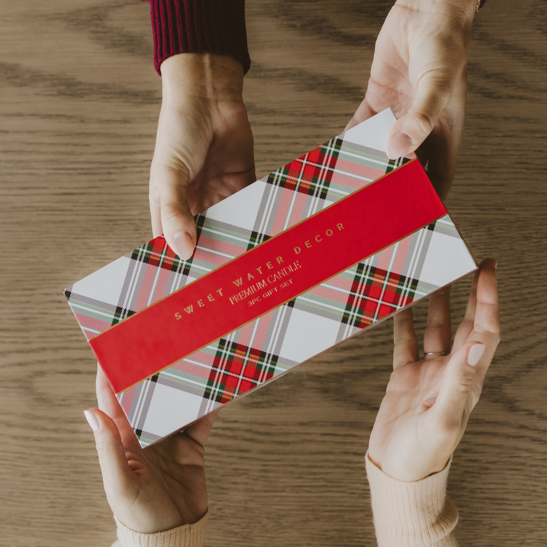 This ready-to-gift Christmas Candle Set includes three of our top-selling seasonal fragrances: Warm and Cozy, Fraser Fir, and Christmas. Each candle comes in a red, green, or gold-striped 5 oz glass vessel and is packaged inside a premium plaid gift box with gold foil details. A perfect grab-and-go luxury candle gift set for the holiday season.