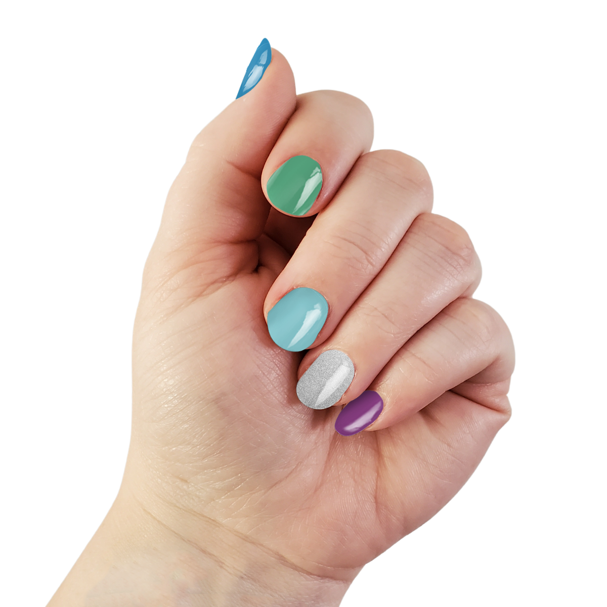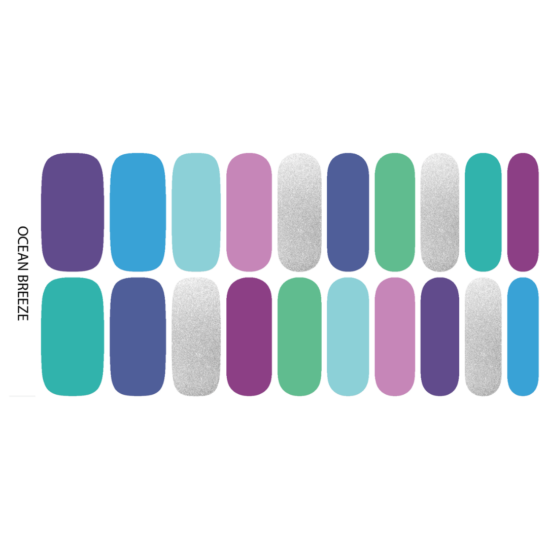 Our Ocean Breeze Nail Wrap Set features a skittle mani of cool blue, aqua, green, and purple solid colors with silver glitter accent nails. This set is perfect for summer vacations and a day at the beach!