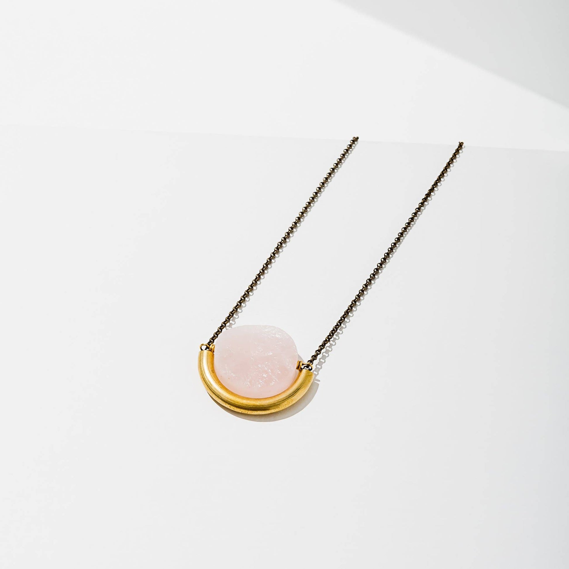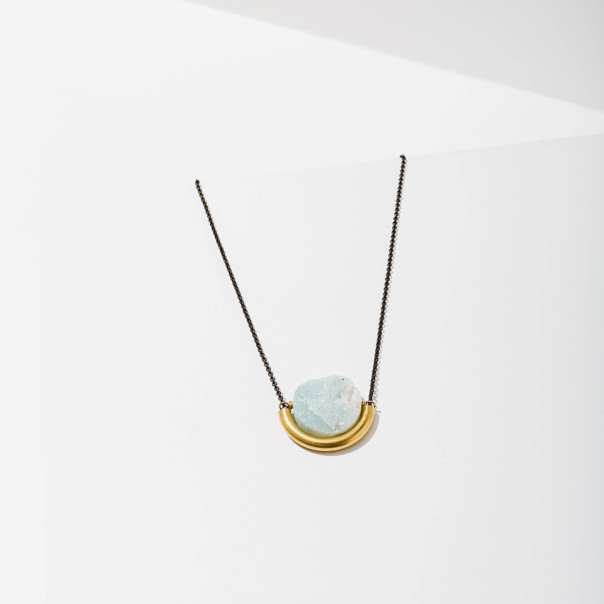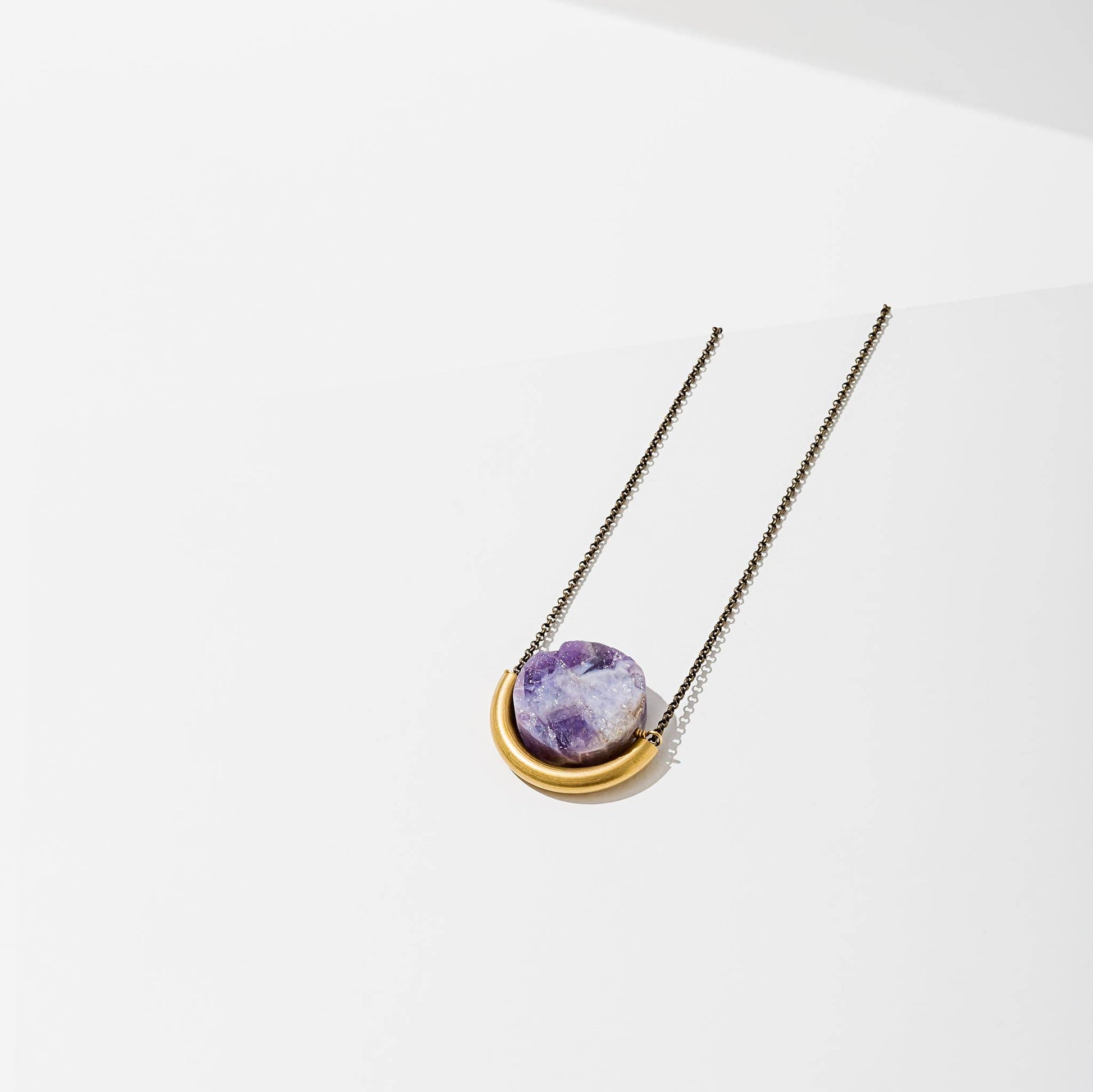 The sun and moon are celestial besties - especially in our Sun and Moon Necklace! This sweet pendant necklace features a rough-cut gemstone of your choosing paired with a brass tube. It all hangs from a 18" long antique brass chain with clasp.