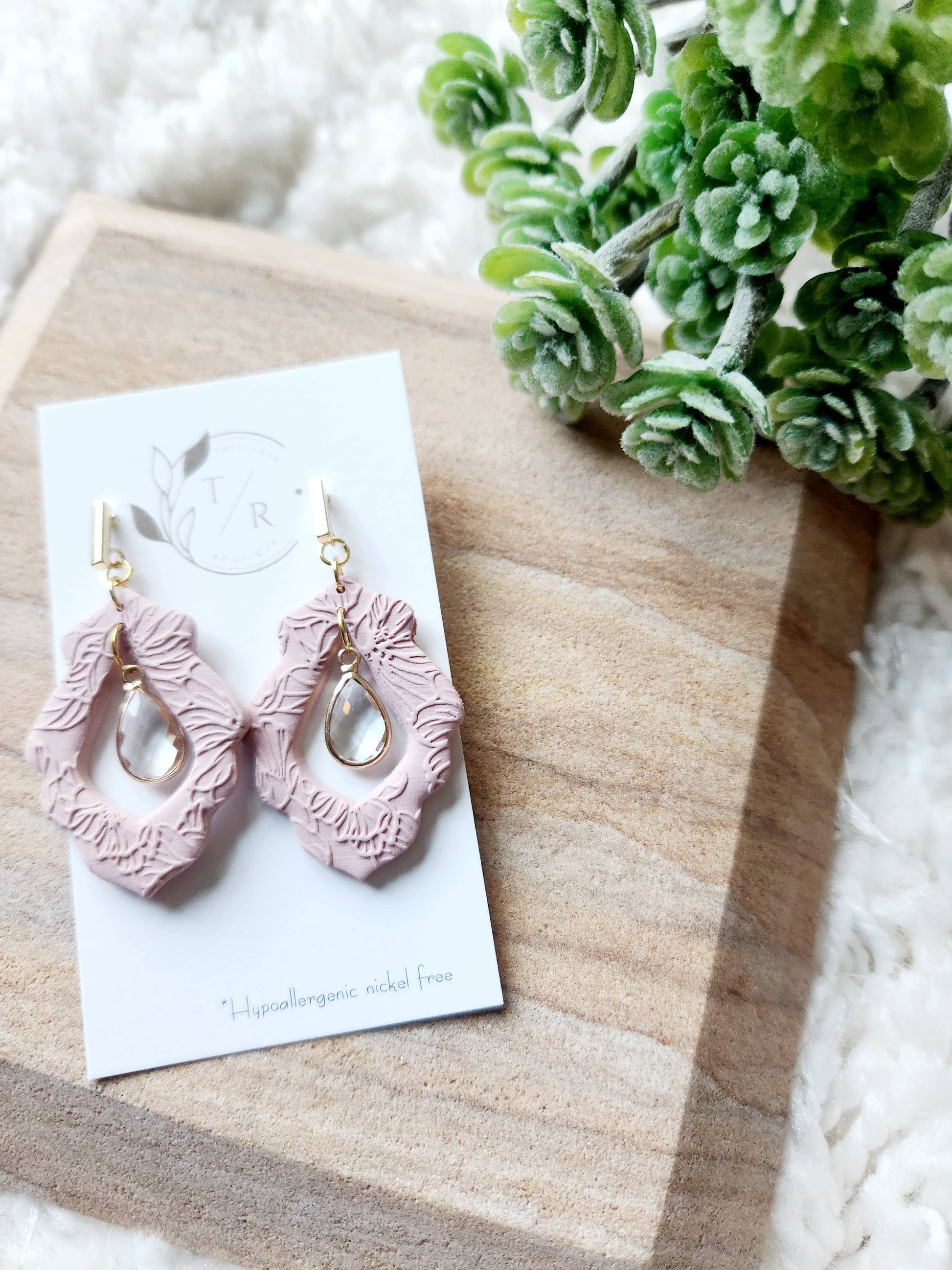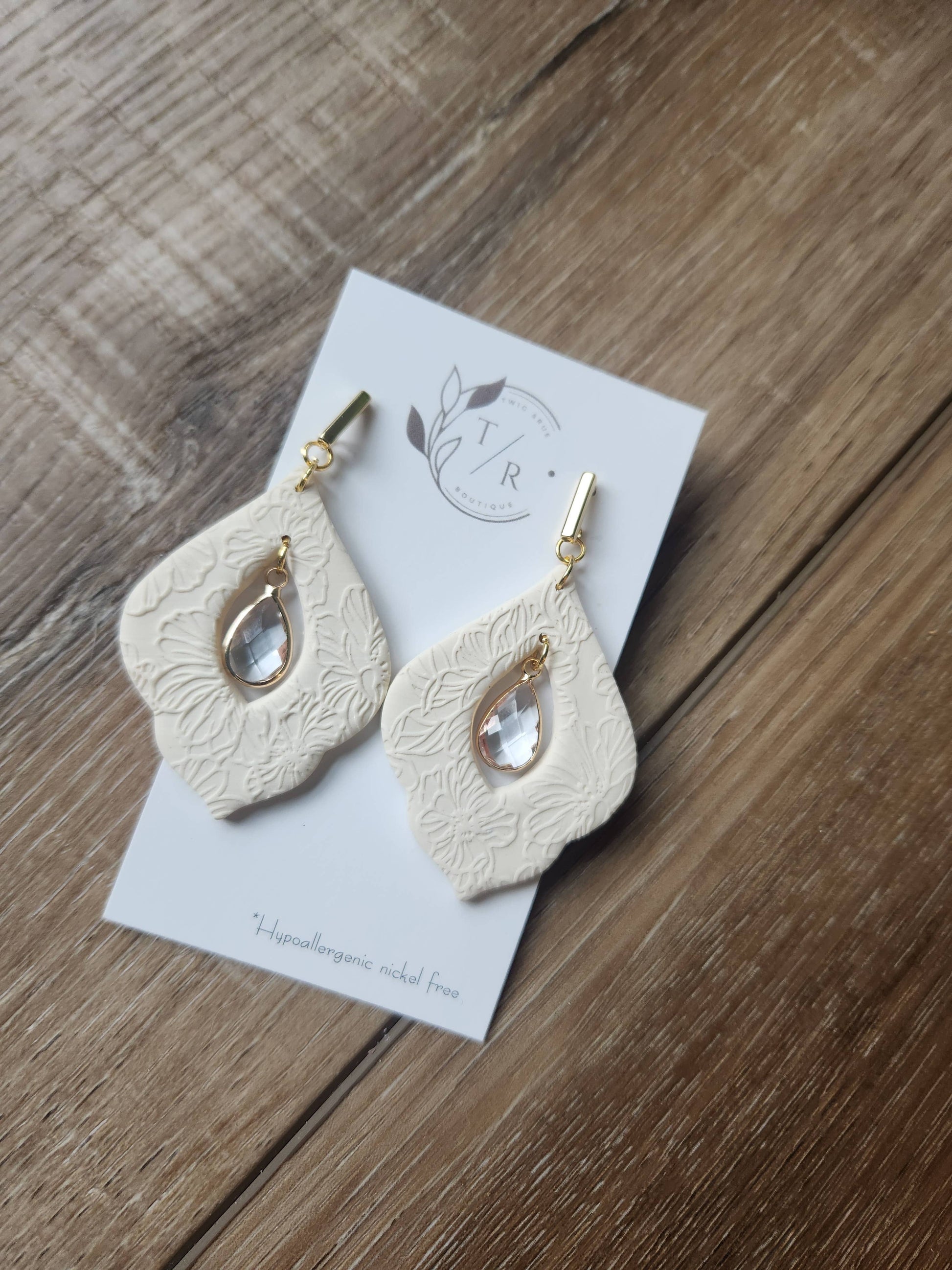 -Handmade and mixed with polymer clay. Clay is embossed for a floral texture. Crystal teardrop and 24k gold stud bar used.